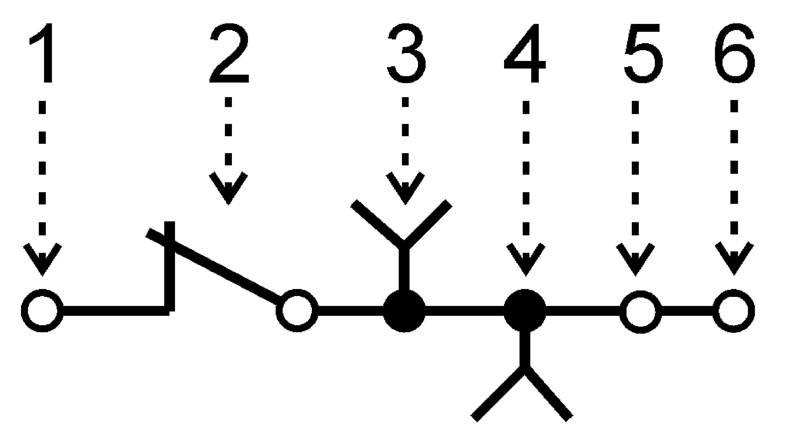 1 – зажим Push-In для подключения провода со стороны линии; 2 – невыпадающий ножевой размыкатель; 3, 4 – ряды шунтирования для соединения клемм между собой перемычками или подключения тестовых шнуров; 5, 6 – зажимы Push-In для подключения проводов со стороны станции. |